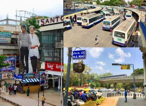 <左>鉄道駅近くの興行街ガーンディナガル。カンナダ映画スターのカットアウト(=人型の切り抜き大看板)がよく見られる。(2014年に撮影) <右上>ケンペ・ガウダ・バスステーションは作中でもちらりと写る市街バスのターミナル。Wi-Fiのマークのような半円が特徴的で、バンガロールのランドマークの一つ。<右下>MGロードはガーデンシティーの異名を持つバンガロールの緑豊かな目抜き通り。ナンマ・メトロが高架上を走る。