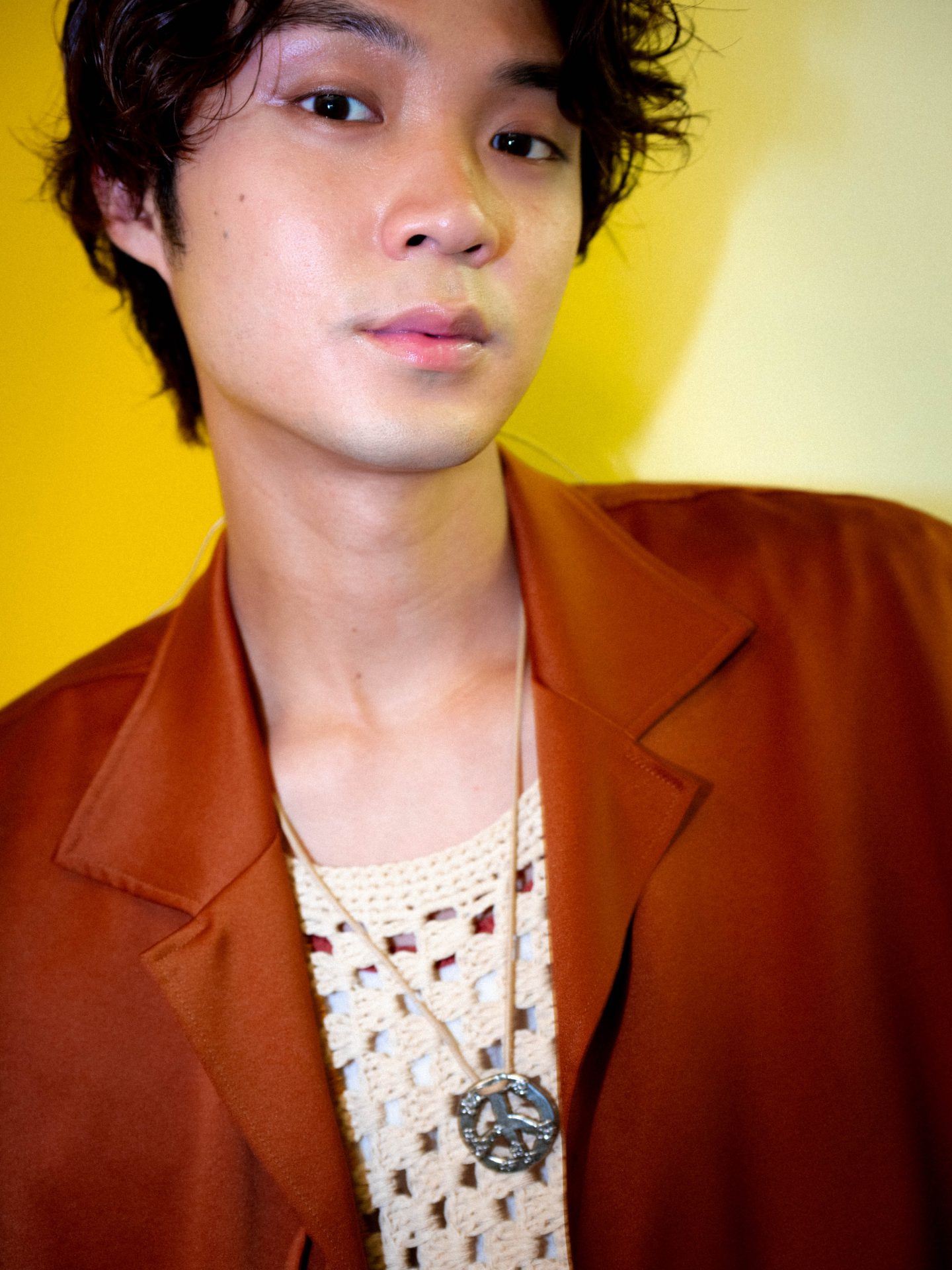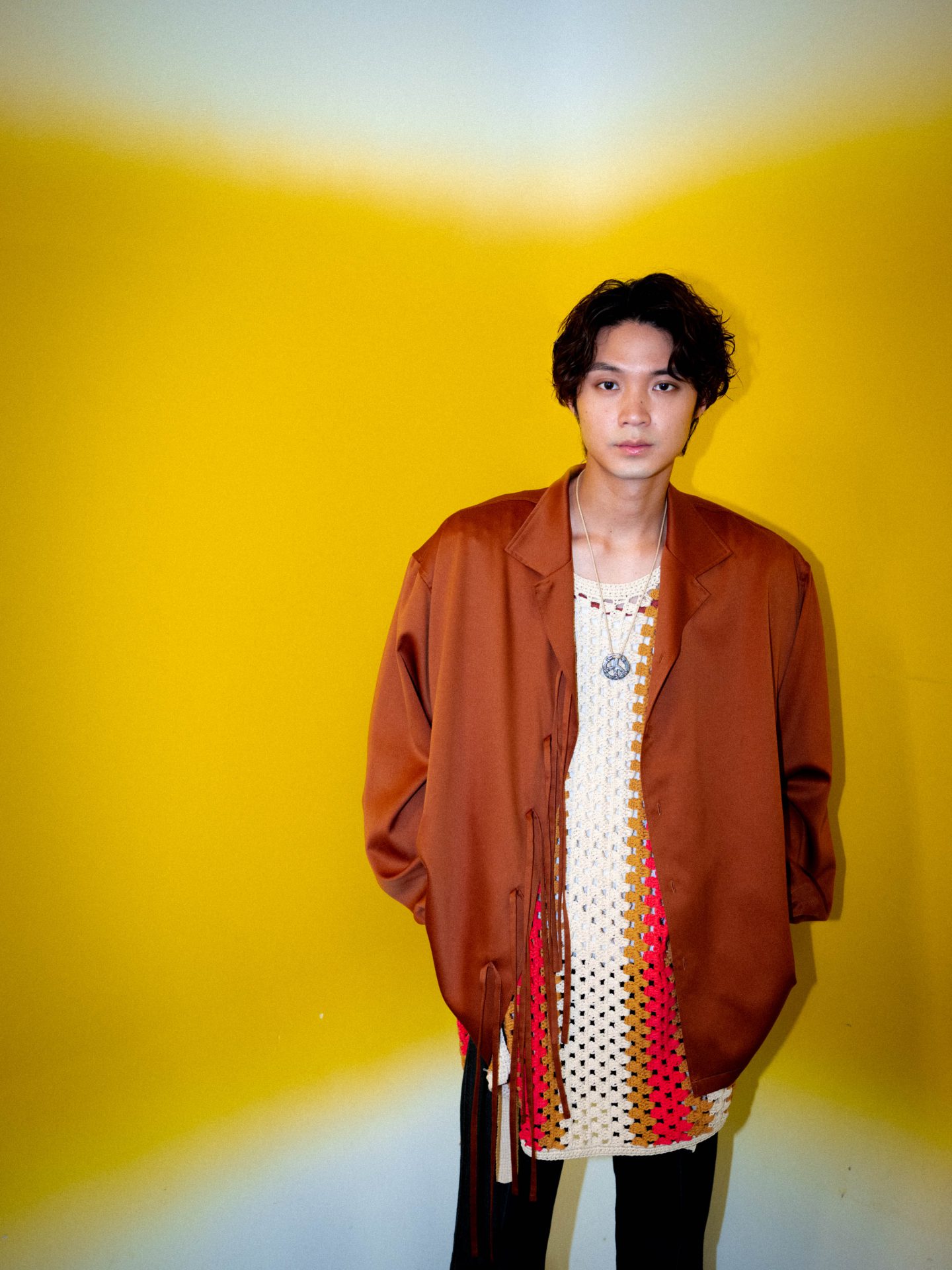 kenichiのシャツ ¥24,000(サカスPR ☎︎03・6447・2762)、DISCOVEREDのニットベスト ¥39,600(ディスカバード ☎︎03・3463・3082)、All Bluesのブレスレット ¥53,900(エドストローム オフィス ☎︎03・6427・5901)、その他スタイリスト私物