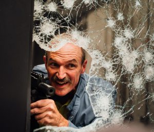 警官のヴァレリー(アレクシス・ラウダー)が勤めるガンクリーク署では、ある理由で勾留されたボブ(ジェラバト)とテディ(グリロ)が鉄格子を挟んで絶賛にらめっこ中。冒頭から中盤までほぼこの状態で、派手なアクションシーンはないまま会話劇が続く。観客はその会話の端々から彼らの関係性や置かれている状況を推測するしかないのだが、汚職警官らの不穏な動きに頭が混乱しかけたところで、アンソニーが大量の風船を持って警察署に登場。そして口笛混じりの軽妙さとは裏腹に、狂気の殺戮劇場の火蓋が切って落とされる!