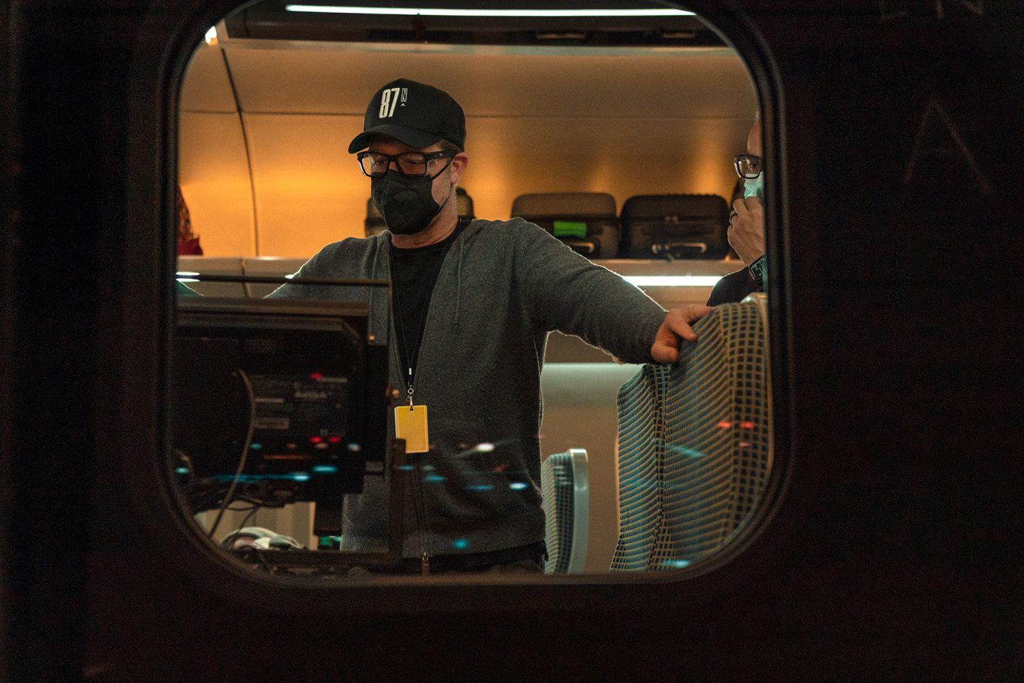 もちろん視覚効果の工夫も見事なもの。12両編成という設定の<ゆかり>号は、実際には2つの車両セットで撮影しているらしいが、スケール感は申し分ない。東京駅とその周辺は、ロサンゼルス・コンベンションセンターを駅に見立てて装飾し、列車の窓の外の風景は、LEDスクリーンを使って車窓に実際の東京~京都間の田園風景を投影した。