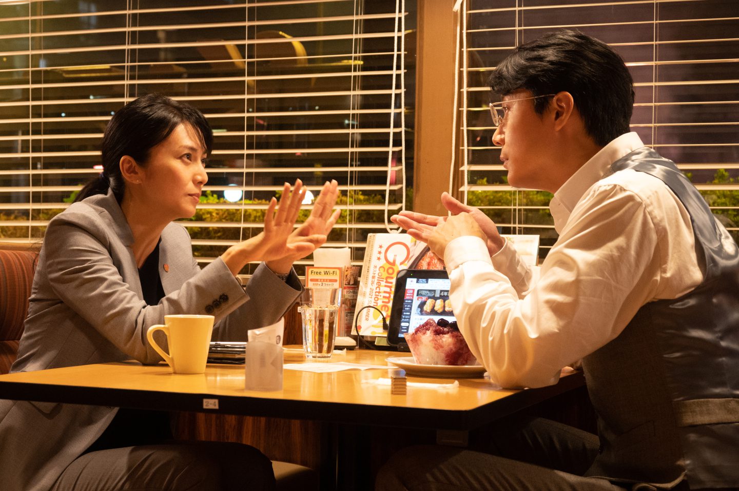 画面上でのふたりのポジションが対照的に捉えられたフルサイズのツーショットから、湯川のワンショットにカットが切り替わる瞬間、間合いを読み、呼吸する湯川(=福山)が口を開く。彼の横顔を捉えたクロースアップは、福山の頭の中であらかじめ編集作業が完成されているかのような印象さえ与える。ショットのサイズ転換を完璧に把握する映画俳優の鑑と言うか、これこそ福山がスタアたる証である。