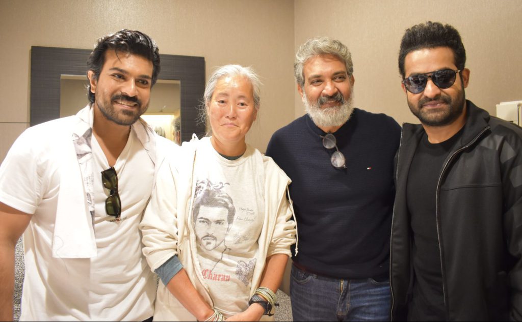 (左から)ラーム・チャランさん、笠井則子さん、ラージャマウリ監督、NTR Jr.さん