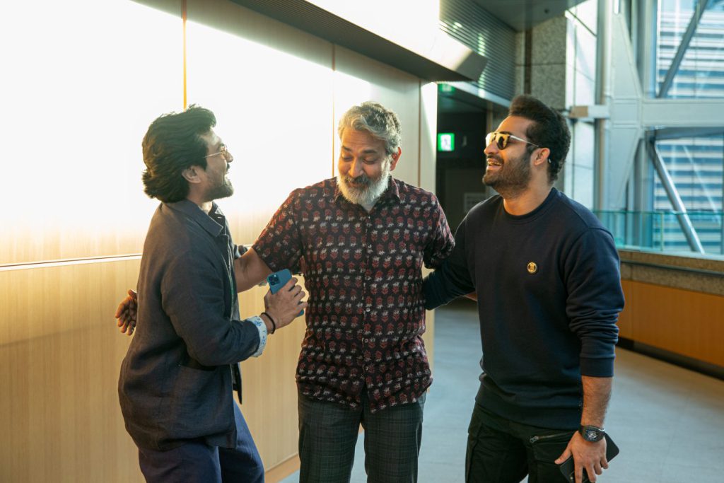 『RRR』(左から)ラーム・チャラン、S.S.ラージャマウリ監督、NTR Jr.