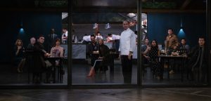 また『ザ・メニュー』は「食事は娯楽か? 生きるためか?」という部分にも言及する。始終グルメオタクに徹して、どんな奇妙な料理も「コンセプトが素晴らしい」と感動してパクつくタイラーに対し、マーゴは一切料理に手を付けない。なぜなら彼女は「必要な時に、食べたいものを食べる」からだ。つまりタイラーとマーゴは真逆の存在――タイラーは娯楽、マーゴはサヴァイヴ――なのだ。よって、タイラーにはグルメオタクにふさわしい料理が振舞われ、マーゴはその食に対する姿勢によって思わぬ事態に向き合うことになるが、それは見てのお楽しみだ。