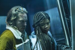 バスでは家出少女レイチェル(『ザ・スーサイド・スクワッド “極”悪党、集結』[2021年]、『透明人間』[2020]のストーム・リード)や、何かと絡んでくるソーシャルワーカーの男ウィル(トラヴィス・フィメル)などと同乗することになるが、その間にもネコババ仲間たちの様子が気になるし、どうにかして確実に逃げる方法を考えなければマズい。血が流れ続ける銃創も手当てしなければ、このままでは死んでしまう。