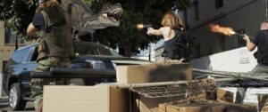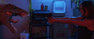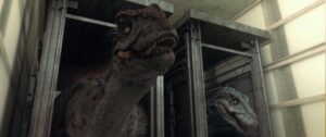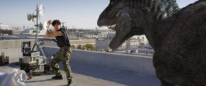さて、ここ数年のアサイラム作品に共通している点だが、やはり3DCGのグレードは上がっている。特に登場する2頭のアロサウルスのディテールは細かく、この手の低予算早撮りパニック映画にしては、なかなかのもの。それでも、おざなりなセットと単調なカメラワーク、あまりこだわりの感じられないパニック演出のせいで、どうしてもチャチく見えてしまうところがなくもないが、許容範囲には収まっていると言っていいだろう。
