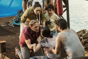 あくまで中心に据えられるのは、油田から脱出しようとすればサメに喰われる、とどまってもサメの体当たりで油田は崩壊間近、さらに海底には時限爆弾と八方塞がり……といったスリリングなシチュエーションだ。エイドリアン・グランバーグが見せたいのは、あくまでドラマティックなサスペンスなのである。