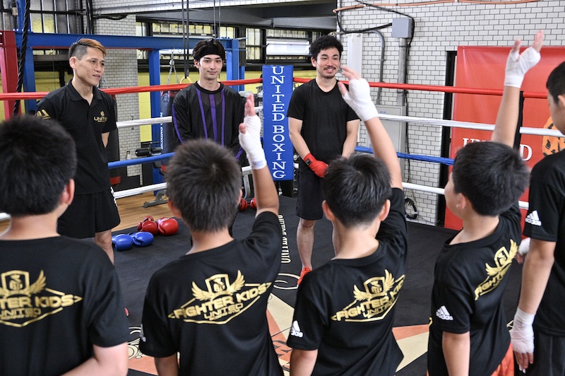 この日限定の“夏休み特別トレーニング”は、元日本Sフェザー級1位の阪東ヒーローが会長を務める「ユナイテッド・ボクシング・ジム」が、『春に散る』の撮影に協力したことから実現したもの。横浜と松浦は坂東会長から「お二人ともプロライセンスをお持ちです!」などと紹介されて、4歳から小学生までの選ばれし練習生8名の前にサプライズ登場。キッズボクサーたちから尊敬のまなざしを浴びながらトレーニングを開始した。