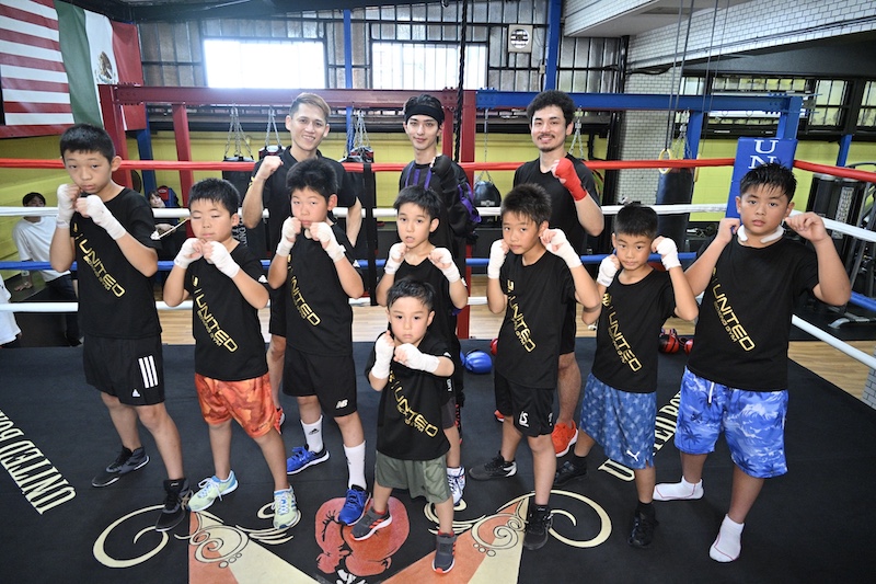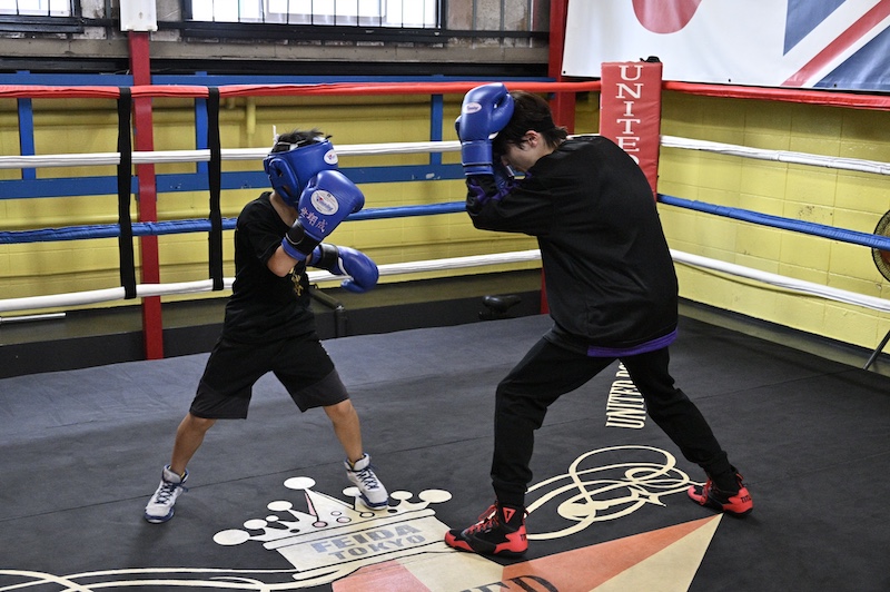 夏休み特別トレーニングの最後を飾ったのは、なんと横浜 VSキッズのスパーリング練習。小3男子と4歳の男の子が勇敢にも名乗りを上げ、横浜を相手にリング上でそれぞれ1分ほどのスパーリングに挑戦した。横浜は見事なフットワークで相手からのパンチを避ける一方で、あえてパンチを浴びることでキッズたちの純真なボクシング愛を体感している様子だった。