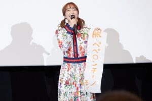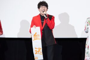 客席からの大きな拍手に迎えられ、キャスト一同、作品にちなんで”赤”を取り入れた衣装で登場。ついに公開を迎えた気持ちを聞かれると、小野は「皆さんについに観ていただけること、そして今日みんなと一緒に登壇できて光栄に思います」と喜びを噛み締める。谷口監督も、コロナ禍での制作を思い返しながら「アフレコ収録が1年半前にあって、スタッフもテレワークなどで連携をとっていましたね。きちんと完成させられたことがありがたいし、よかったです」とコメントした。