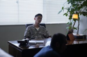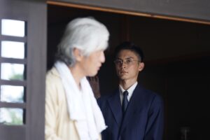 サングラスをかけ、どこかへ電話している様子、椅子に座り、怪訝そうな表情を浮かべる様子、そして笠原(佐藤浩市)をまっすぐに見つめる姿からは、今までのキャリアを積み重ねてきて貫禄を持った高良の演技が伺える。