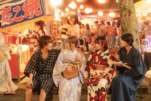 甚平姿の英二、シンプルな浴衣姿の直彦、淡い色味の浴衣を着た小春や、赤が映える椿柄の浴衣を着た泉など、4人のキャラクターのイメージに合った浴衣姿にも注目だ。