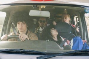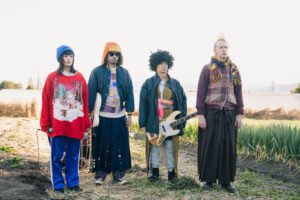 パンクファッションとは異なった和服をモチーフにし、独特なアレンジを施した衣装に包まれる「ザ・ゲスイドウズ」の4人。場面写真は、何を考えているか伝わらない4人の表情がとても印象的。マネージャー高村の姿も。