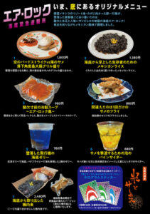 映画のキャッチコピー“いま、底にある危機”にちなんで制作されたメニューは、飛行機墜落の原因となる鳥と海の捕食者サメの肉を使用したグリル盛り合わせ<空のバードストライクVS 海のサメ落下角度最大級グリル盛り>、海に沈んだ飛行機の中でどんどん酸素が無くなっていく酸欠状態をイメージした<酸欠寸前の冷製スープ〜エア・ロック風〜>など全7種類。