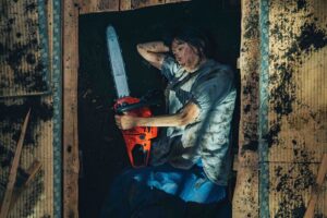 生い茂る緑の中で夏らしい黄色のワンピースを着てチェーンソーを抱きしめ、何かに心を馳せる表情を浮かべるのは、主人公桃子に扮する江口のりこ。その姿にひんやりと肝を冷やす残暑見舞いカードが到着した。そして共にお届けするのは、まさに昨年の今頃、灼熱の太陽の下で敢行された映画撮影中のキャストとスタッフたちの笑顔の舞台裏を集めたエモすぎるメイキング予告動画。