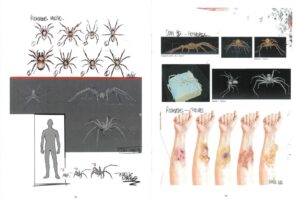 本作で長編デビューを果たしたセヴァスチャン・ヴァニセック監督は、絵の才能にも長けており、キャラクタービジュアル、ストーリーボードなどの絵作りのアイデアは、全て監督自身がシナリオに書込んでいる。限られた予算とシチュエーションの中で製作されながらも、それを感じさせない鬼気迫る画作りが実現した。今回は、そのスケッチとストーリーボードを一部公開。スケッチからも分かるように、クモのビジュアルから傷口のデザインまで事細かなところまで監督のこだわりを感じることが出来る。