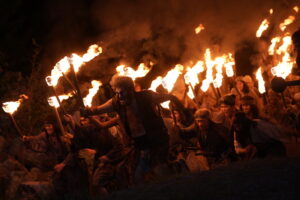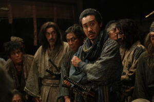 ひそかに倒幕と世直しを計る、大泉洋演じる主人公・蓮田兵衛が、鋭い眼光で何かを見据えるカットや、そんな兵衛が堤真一演じる悪友であり敵である、骨皮道賢と手に汗握る鍔(つば)迫り合いを繰り広げる様子など印象的な場面が公開されたほか、兵衛と出会ったことをきっかけに修行に励み“無敵の棒術”を身に付けた長尾謙杜演じる才蔵が、六尺棒を構えるアクションシーンの一幕、志一つに松明を手に駆ける一揆の民衆、そして、仲間たちを従えた兵衛が睨みつけながら両手に刀を握る場面など、迫力満点の場面写真となっている。
