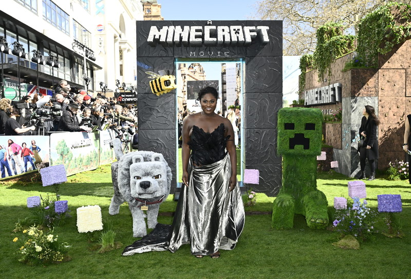 当日のロンドンは、プレミアにふさわしい快晴に。会場となったロンドンのレスター・スクエアは、レッドカーペットの代わりに本物の芝生が敷かれ、劇中に登場する四角いオオカミのデニスや、人気キャラのクリーパー、四角い木や花などをあしらった、まるで“マイクラワールド”に入り込んだかのようなプレミアムな空間に。