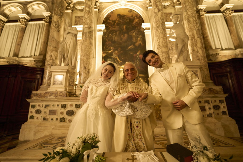 常に2番目を選ぶように教えられてきたマリアが1番の相手と結婚式を挙げるシーンで、玉城ティナも、花婿・ロレンツォと神父のイタリア人キャストと和やかな笑顔を見せる。