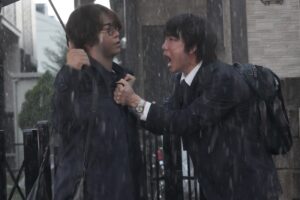 実はこのシーンは人口的に雨降らしを行っているのではなく、なんと本物の豪雨だったのだ。テスト段階では晴天だった天候が本番直前で急に雲行きが怪しくなると、あっという間に豪雨が訪れた。綾野がこのシーンの撮影について「亀ちゃんは嵐まで呼んじゃうから!本当に強烈だった」と笑うと、亀梨も「それは剛くんでしょ!すごいですよ。最初は(スタッフによる)雨降らしだったのにリアル雨ですから。一瞬、10分くらい一気に」と続ける。さらに「傘も(足元に)置いておかないといけないのに風がすごいからギリギリまで剛くんが押さえていて。で、(本番が)終わった後パーン!と晴れて『嘘でしょ!?』って。」と目を大きくしながら語ると、綾野も「普通に見たらスタッフさん降らせすぎって思うくらいの。(あまりに強い風と突然の豪雨に)脅威さえ感じた」と、奇跡のような出来事を興奮気味に振り返った。