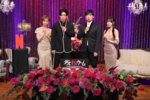 本作配信に先駆けて、9月2日(火)にNetflixプレゼンツ「お色気記者発表会」が開催された。出演者の中から、挑戦者の劇団ひとりと野田クリスタル(マヂカルラブリー)、そしてあの手この手で芸人たちを惑わす美女として登場する八木奈々と紗倉まなの4名が登壇し、ラグジュアリーな雰囲気の中、人生最高のキスの話や、大物俳優に個人レッスン!?、ズボン爆発珍事件など“デスキスゲーム”撮影中の(秘)エピソードをなど、裏話を語り尽くした。