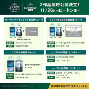 9月22日(月)より、パンフレットやスペシャルグッズも付いた豪華セット仕様での販売が決定。両作品の魅力を余すことなく凝縮した劇場パンフレットを2作品のムビチケ2枚とセットで事前販売。ライブフィルムは伝説のライブ「FJORD」の空気感をそのまま閉じ込めた冊子仕様、ドキュメンタリー映画はメンバーの素顔を切り取ったフォトカード仕様となっており、これらを特製ケースに収めた豪華なコレクターズアイテムとして販売。ムビチケとセット購入していただいた方にのみ、映画の公開前週(11月21日)から順次発送が行われるが、映画公開前にパンフレットが販売されるのは異例のこと。鑑賞前に読み込み、映画への期待感を高めるもよし、本編のネタバレを避けて、鑑賞後に余韻に浸りながら楽しむもよし。ファン必携のアイテムを、それぞれのスタイルで楽しむことができる。加えて、スペシャルグッズ「MGAムビチケアクリルフレーム(オリジナルBOX付)」の販売も決定。2作品のムビチケ2枚とのセットのみで購入が可能な本グッズは、公開日を指折り数えて待つファンにはマストゲット商品だ。