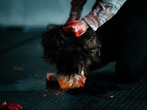 ティザー映像では、紅く染まった工具や人間の“皮”を天日干しする異様な光景など、才気あふれる椅子職人・九条新介の狂気の工房が垣間見える。さらに公開された場面写真には、制作の最中に返り血を浴びた九条の姿や、人の頭部らしきものを持つ不気味な手も——。R18指定、超過激スラッシャー・ムービーの片鱗をのぞかせている。
