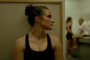 映像は、緩やかな同調圧力をかけてくるチームメイトに対し、ジュリーが自らの意思を貫こうとするシーン。固定カメラによる静謐なフレーミングの中、光と影のコントラストに人物が沈み込み、そこから突然場面が動き出すことによって、一人の少女の心情が浮かび上がっていく。