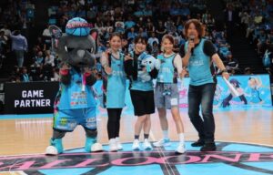 そしてついに試合が始まり、20分間のハーフタイムでは、ゾンビランドサガの楽曲をBGMに、田野と衣川の2人が大歓声の中登場。先ほどの選手呼び込みについてMCから感想を求められた衣川は、「すごく貴重な体験ができて嬉しかったです!自分たちの声で試合や選手の皆さんを盛り上げられたら、という気持ちでやらせていただきました」と興奮気味に語り、始球式を行なった田野は「この場でバスケットボールの始球式ができたことは人生の宝物です」と口にしつつ、ゴールをボールに入れる難しさを実感したとの事で、「改めて選手の皆さんが日々どれだけ練習されているのかという事も、実感ができました」と笑顔で振り返った。