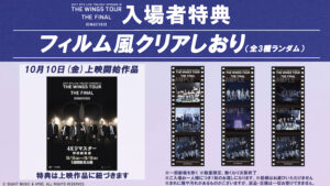 10月10日(金)の上映開始日から配布される入場者特典は、「フィルム風クリアしおり(全3種ランダム)」に決定した。<2017 BTS LIVE TRILOGY EPISODE III THE WINGS TOUR THE FINAL>のライブ中のカットを使用したエモーショナルなデザインとなっている。