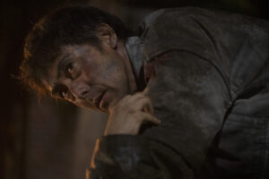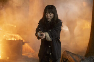 今回公開された場面写真には、登場人物それぞれが真実に迫るカットとなっている。阿部寛演じる山縣泰介は顔に血と泥をつけて姿が…。身も心もボロボロになったボロボロな泰介の力強い眼差しで何かを見つめている。芦田愛菜演じる泰介を追う謎の大学生・サクラは、炎の中で泰介と同様にススまみれになりながら、刃物を構えている緊迫のシーン。サクラが刃物を向けている先には……。