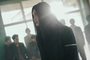ケンカの強さだけを信じて街の外からやってきた桜。不良の巣窟と恐れられる風鈴高校に入学早々、「てっぺんを取る」と宣言した彼の挑発に、教室の空気が一瞬で張りつめる。その言葉に最も反応したのは、長髪をなびかせる寡黙な男・杉下。怒りをあらわにし、机を持ち上げて桜に投げつける。軽やかにかわす桜だったが、次の瞬間、杉下の拳が机を貫く。凄まじい衝撃に教室中が息をのむ中、思わず腰を抜かす楡井(木戸大聖)——。のちに仲間として結ばれる<防風鈴>1年生たちのすべての始まりとなる出会いのシーンにして、衝撃のアクションが炸裂する必見の場面が描かれている。
