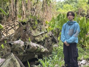 また、写真にもある、砲撃で天井が抜け落ちた日本軍司令部跡では、トイレや浴槽といった生活の痕跡も色濃く残っている。米軍が最初に上陸し、激しい戦いで砂浜が血に染まったオレンジビーチでは、当時の日本兵と自身が同年代であることに触れ、「今自分が立っている場所と同じ位置から日本兵が同じ景色を見ていたかもしれない」と静かに語った。当時の生活が色濃く残るペリリュー島の跡地を巡る中で板垣は、戦争が「これまでのように物語の中のものではなく、ノンフィクションとして感じる」と、その重みを噛みしめていた。