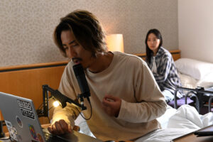 映画出演というまさかのお声がけに驚きつつも、それ以上にワクワクが先に立ちました。まずは劇中で歌唱する楽曲の歌詞制作から関わらせていただきましたが、脚本家・丸山昇一さんによるラップ詞は飾り気がなく、生と死の狭間で削ぎ落とされた言葉の強さがあり、その熱量をどう自分のラップとして立ち上げるか、悩みながら向き合いました。自分の音楽とは違う世界観でも、ラップすることで“gbというフィルター”がかかり、役にも自然とシンクロしていく感覚があり、不思議で忘れられない体験でした。また、高橋伴明監督はセリフだけでなくラップの一言一言についても“言葉の温度”をすごく大切にされていて、そのこだわりは僕自身の作詞にも通じ、撮影中ずっと刺激を受けました。この経験はこれからの曲づくりにも必ず活きると思っています。初めての撮影で緊張していた僕に、主演の毎熊克哉さんが気さくに声をかけてくださり、柔らかな空気に救われました。本番で見せる繊細さとアーティスティックな存在感には何度も惹き込まれました。現場は“その瞬間を生きる人間”を見つめ続けるような時間で、そこにいられたことは僕にとって未体験の奇跡でした。未熟ながら全力で挑んだ作品です。観てくださる皆さんが、それぞれ何か大切なことを受け取ってくださったら嬉しいです。
