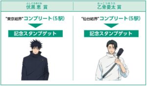 首都圏エリア・東北新幹線区間・仙台エリアの指定のスポットを回遊すると、虎杖悠仁・伏黒 恵・乙骨憂太・脹相のオリジナルボイスを聞くことができる。首都圏・仙台から1スポット以上、および東北新幹線区間5スポット達成でオリジナルアクリルキーホルダーをプレゼント。(数量限定)
