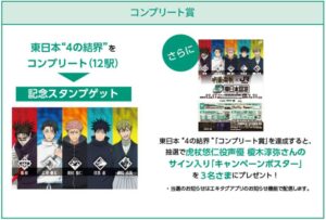 「エキタグ」アプリをダウンロードし、スタンプ帳を開いてエントリーのうえ、JR東日本管内の4つのエリア(以下、東日本“4結界”)の駅に設置されたスタンプを獲得すると、TV アニメ『呪術廻戦』第3期「死滅回游 前編」の場面カットを用いたスタンプやキャラクターの記念スタンプが手に入る。さらに“仙台・岩手・青森結界対象5駅限定”で掲出する限定オリジナルポスターや、虎杖悠仁役 声優 榎木淳弥のサイン入り「キャンペーンポスター」が抽選で3名に当たる。