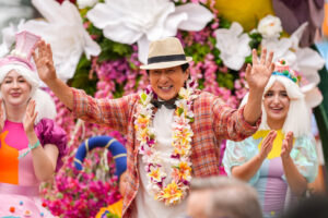 あるきっかけから赤ちゃんパンダ“フーフー”の里親となったジャッキーは、フーフーがいるノア動物園に向かうことに。動物園は世界的アクションスターの来訪にお祭り騒ぎ。到着するなり美女たちによるフラダンスで迎えられ、多くのファンが待つ中をオープンカーでパレード。場面写真では、パレードで大歓迎を受け、思わず笑顔全開のジャッキーの姿がとらえられている。かつて数々の激しいアクションシーンでクールな表情を見せてきた大スターが一転、新年から思わずハッピーになってしまうような表情を見せている。