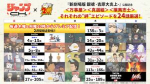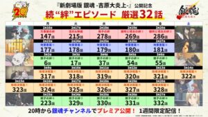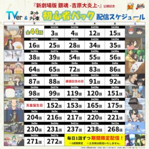 今回、『新劇場版 銀魂 -吉原大炎上-』の公開を記念して、「ジャンプチャンネル」「銀魂チャンネル」「TVer」「ネットもテレ東」でアニメ『銀魂』合計103話の一挙無料配信が決定した。「ジャンプチャンネル」と「銀魂チャンネル」では、1月8日(木)より毎週月曜日と木曜日に配信。『新劇場版』の予習エピソードとして、登場人物たちの絆をテーマにしたエピソードを厳選。『新劇場版』公開後の2月13日以降は、「銀魂チャンネル」で映画をより楽めるエピソードを配信する。また、「TVer」「ネットもテレ東」ではアニメ『銀魂』の初心者パックとして、実写化されたエピソードやネットで話題になったエピソードを中心に公開1か月前から平日毎日1話ずつ配信する。