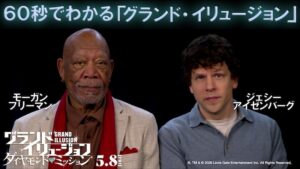 スーパーイリュージョニスト集団「フォー・ホースメン」が華麗なイリュージョンを駆使して悪を暴く「グランド・イリュージョン」シリーズ。待望の最新作では、新世代マジシャンも仲間に加わり、世界を舞台に史上最大の強奪計画と壮大な因果応報のショーの幕が開ける。観客さえも欺く最高峰のクライム・エンターテインメント『グランド・イリュージョン/ダイヤモンド・ミッション』が、5月8日(金)より公開される。このたび、シリーズ1作目から出演する俳優のジェシー・アイゼンバーグとモーガン・フリーマンが解説し、全世界がダマされたこれまでの物語を1分で一気におさらいする特別映像が解禁となった。