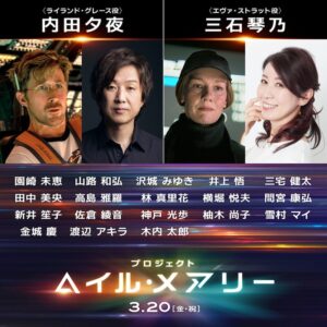 このたび、ライアン・ゴズリングが演じる中学校の科学教師グレースの日本版声優に内田夕夜、グレースを宇宙に送りこむプロジェクトリーダー、ストラット役に三石琴乃が決定した。そして、沢城みゆき、佐倉綾音、三宅健太、山路和弘ら人気と実力を兼ね備えた声優陣も本作に集結。