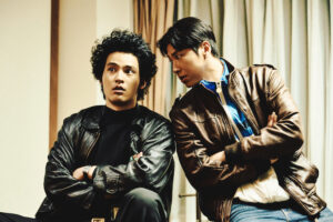 また、豪快なラリアットをぶちかまし、相葉の背後で犯人が宙を舞っている相葉渾身の“職務執行シーン”も。アフロにサングラス、プロレス技で大暴れする相葉と、クールなブラウンの革ジャンに身を包み足技で相手を蹴散らすチェ・シウ。決して交わらないはずの二人の個性が混沌の街・新宿で互いを刺激し合い、制御不能なほどのエネルギーを増幅させていく。