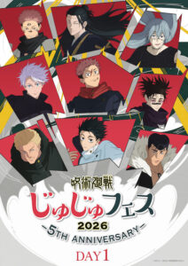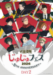 今回、2026年8月29日(土)・30日(日)に開催される、アニメ『呪術廻戦』5周年を締めくくるフィナーレイベント<じゅじゅフェス 2026 -5th anniversary->のイベントビジュアルが公開された。虎杖悠仁をはじめ、『呪術廻戦』を彩る主要キャラクターが集結した、華やかなビジュアルに仕上がっている。さらに、DAY1とDAY2出演キャストの演じるキャラクターごとにまとめた“DAY1 ver”と”DAY2 ver“も公開となった。