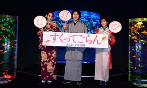 尾上松也が初主演し、ももいろクローバーZのリーダー・百田夏菜子が初のヒロイン役を務める世界初⁉”⾦⿂すくい映画”『すくってごらん』(3月12⽇(⾦)公開)の公開間近を記念して、3月3⽇が“⾦⿂の⽇”であることにちなんで、その前⽇の3月2⽇(火)に“プレ⾦⿂の⽇”イベントが東京・⽇本橋のアートアクアリウム美術館にて開催。尾上松也、百田夏菜子(ももいろクローバーZ)、共演の⽯田ニコルが映画の世界観さながらの和装で登壇。⾦⿂の魅⼒や映画の⾒どころなどをたっぷり語った。
