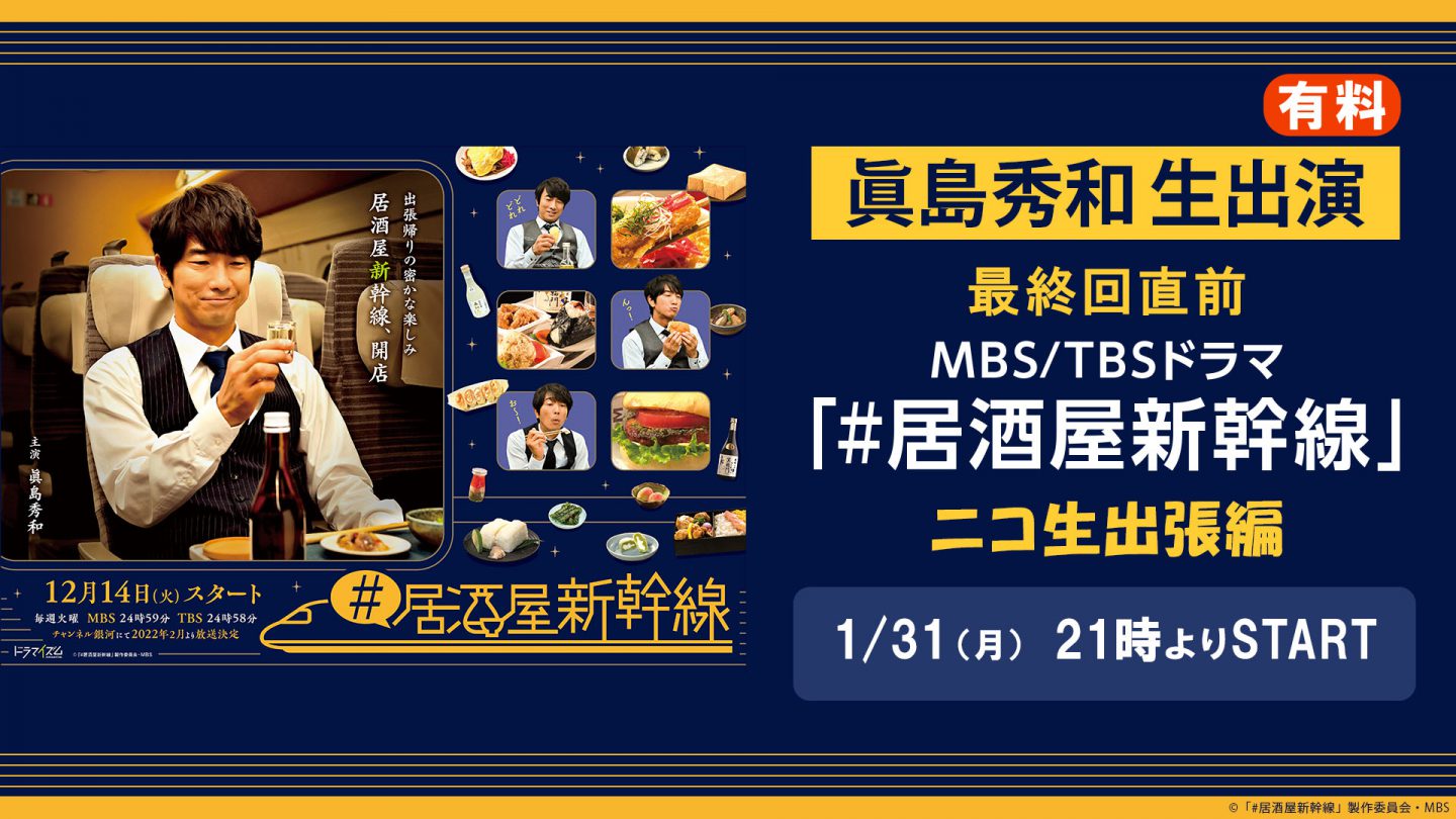 MBS/TBSドラマイズム枠にて絶賛放送中のグルメドラマ「#居酒屋新幹線」より、2022年2月8日のMBS/TBSでの最終回前に高宮進役の眞島秀和生出演で、「ニコ生出張」と題したオンラインイベント実施が決定!眞島秀和は、「おっさんずラブ」シリーズ(2018年~)、「サウナーマン 汗か涙かわからない」(2019年)、そして大河ドラマ「麒麟がくる」(2020年)では明智光秀の盟友、細川藤孝役を熱演するなど、数々の話題作に出演。経済ドキュメンタリー番組「日経スペシャル ガイアの夜明け」のナレーターなど、ますます注目度が高まっている。