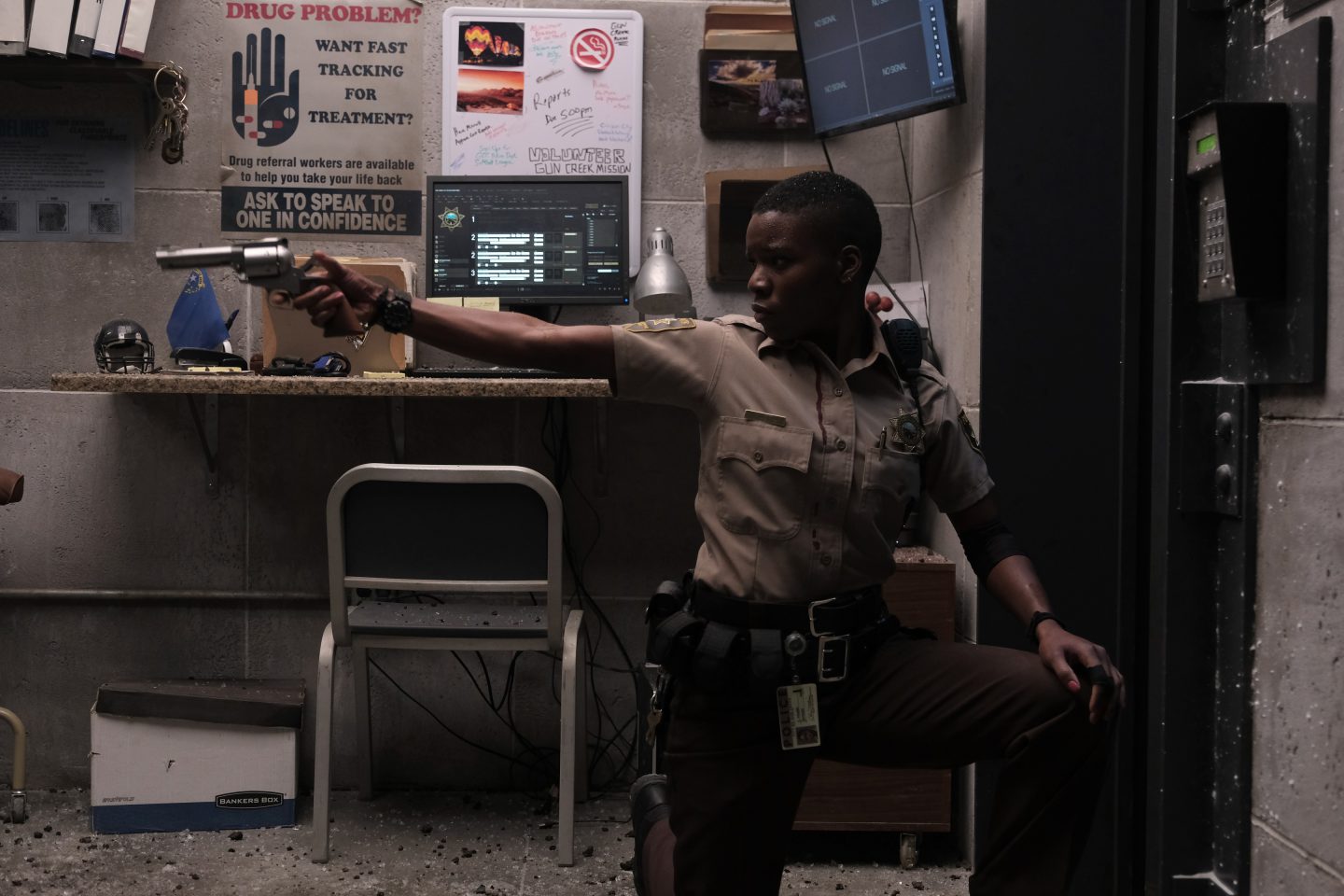 舞台は広大な砂漠地帯に佇む小さな警察署。ほんの数人の夜勤の警官たちが、のほほんとルーティンワークをこなしているこの警察署に、手練れの詐欺師、冷酷非情な殺し屋、サイコパスの殺人鬼という“普通じゃない”悪党3人が集結。そこに射撃の名手にして正義感の強い新人女性警官が加わり、気づけばこの世のモラルも法律も一切通用しない四つどもえのサバイバル・バトルに——!!