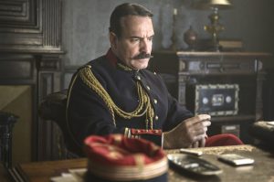 主人公のピカール少佐は、参謀本部第二局(情報局)統計部(諜報部門)の部長に異例の抜擢を受け、中佐に昇進。袖の階級線が、すぐに金線と銀線が交互に並ぶ中佐のものに変わるのが分かる。参謀本部員は飾緒を右肩に付ける、というのはこの時期のフランス軍のルールだ。さらに両肩には略式肩章を付けていて、これが常装にあたる。パーティーのシーンでモール飾りの下がった大きな正肩章を付けているシーンもあるが、これは礼装にあたる。中佐用は、本体の中心部が銀色、その他が金色だが、この映画、ほんのワンシーンでも手を抜いていない。