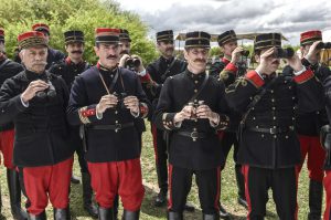 劇中、野外で75ミリ速射砲の威力を軍人たちが見学するシーンがあり、赤ズボンに黒い肋骨服(ろっこつふく)というのが、当時の略装、野戦装にあたる。特に将官クラスは、階級に応じた数の肋骨装飾を付け、赤いケピ帽にも派手な金色の刺繍で階級に応じた装飾を入れる。同じ将官でも、旅団将軍(少将)なのか師団将軍(中将)なのか、はたまた大将相当の軍司令官なのかで、これまたラインや装飾の数が異なる。実にフランス軍の制度は複雑ですが、この映画はきっちり再現している。