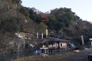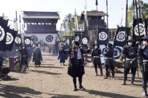さらに、信長が幼少期を過ごし、濃姫を迎え入れた城である那古野城や標高329mの金華山に築かれた城である岐阜城の一部を、超大規模オープンセットで作成。那古野城はその規模感も驚愕だが、それに合わせて数百人の出演者が結集、スケール感あふれる映像が撮影された。岐阜城は立地の険しさを表現するため、岩壁に囲まれた斜面を使って、岐阜城の一部を建てた美術部の渾身作で、岩肌を流れる滝をそのまま活用するなど、そこにある自然を最大限に活かした見事なセットである。