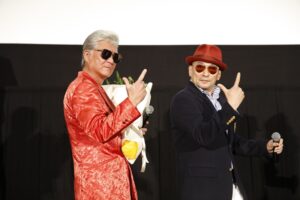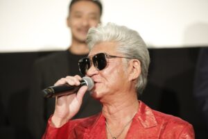 そしてスペシャルゲストとして、主題歌を担当した、クレイジーケンバンドの横山剣が花束を持って登壇。横山は本作を観て、「全身全霊で取り組む皆さんの迫力にただただ圧倒された。後半は涙腺崩壊という感じだった」と大絶賛。本作のために主題歌「こわもて」を書き下ろした横山は、「最初脚本をいただいて、どの時代か、近未来なのか昭和なのかわからない感じもあったし、日本なのかアジアなのか、不思議な感じがあったけれど、昭和な感じで行ったらいいのかなと思った」と話し、タイトル「こわもて」の由来について聞かれると、「こちらにいらっしゃいます」と小沢を指し、「イイねっていう感じですね!」と自身の名言で会場の笑いを誘った。
