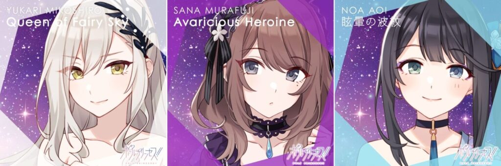 御子白ユカリ(CV.南條愛乃)/「Queen of Fairy Sky」/紫藤サナ(CV.日高里菜)/「Avaricious Heroine」/蒼唯ノア(CV.早見沙織)/「眩暈の波紋」©エイベックス・ピクチャーズ/タツノコプロ/ポールプリンセス!!製作委員会